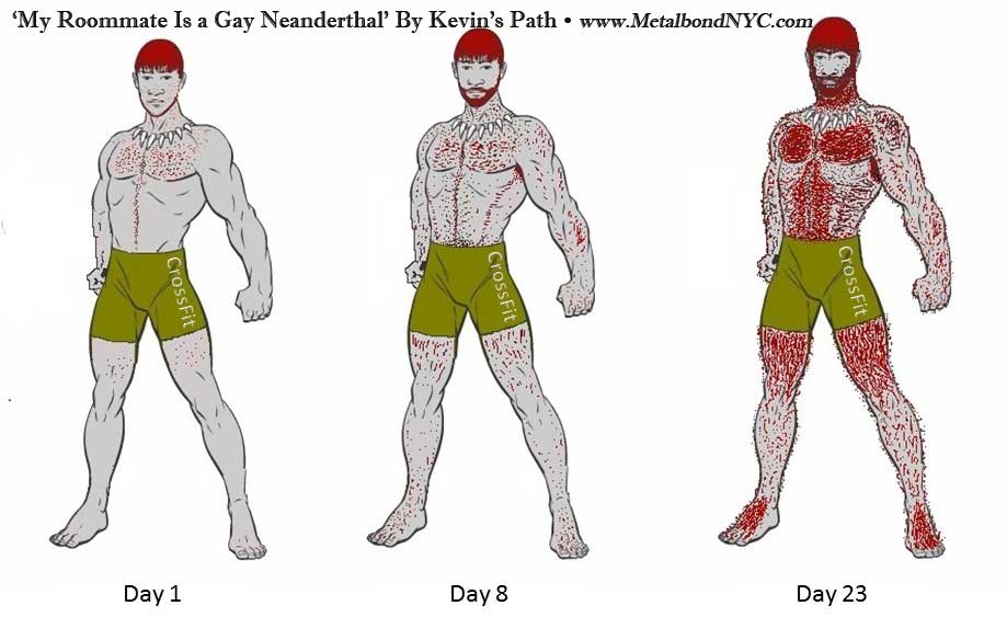 I had him get naked and stand against the wall to take the photos for “regression day 23.” Garin’s transformation was very advanced now. He was hairier than Forrest Griffin and built like an MMA fighter. He pointed and gestured through the door to the poster presentation that I was assembling for the conference. He wanted to help with it. “You are helping, pal. The presentation is all about you. You’re going to be famous! The best thing you can do to help is cooperate and do what I tell you. And, don’t get in any more trouble.”
